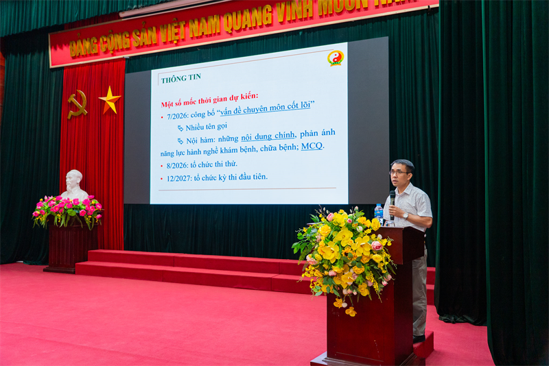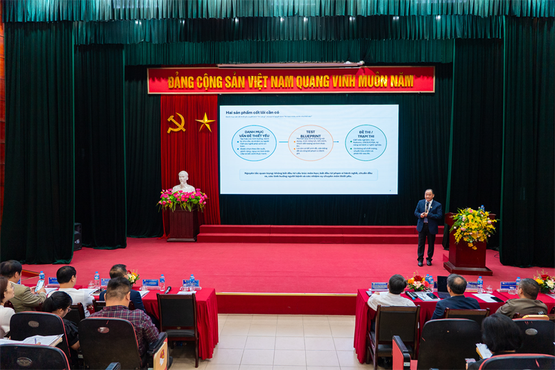 Trình bày báo cáo hướng dẫn xây dựng danh mục các vấn đề chuyên môn cốt lõi, TS. Nguyễn Đức Khánh nhấn mạnh quy trình từ hình thành câu hỏi, phát triển câu hỏi đến xây dựng ngân hàng câu hỏi, đồng thời ban hành cấu trúc đề thi và ma trận đề (test blueprint) phục vụ kỳ kiểm tra.