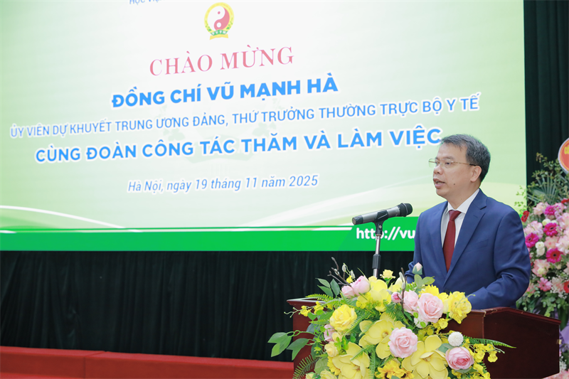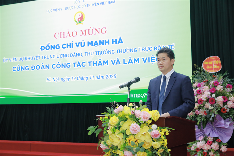 Phát biểu tại buổi lễ, Thứ trưởng TS.BS. Vũ Mạnh Hà bày tỏ sự trân trọng đối với những đóng góp của các thế hệ nhà giáo - những người đang âm thầm truyền lửa, bồi đắp tri thức và gìn giữ giá trị của nền y dược học cổ truyền dân tộc. Đồng thời, Thứ trưởng nhấn mạnh kỳ vọng Học viện sẽ tiếp tục đổi mới đào tạo, đẩy mạnh nghiên cứu, nâng cao chất lượng nguồn nhân lực y dược học cổ truyền, đáp ứng yêu cầu chăm sóc sức khỏe nhân dân trong bối cảnh hội nhập.