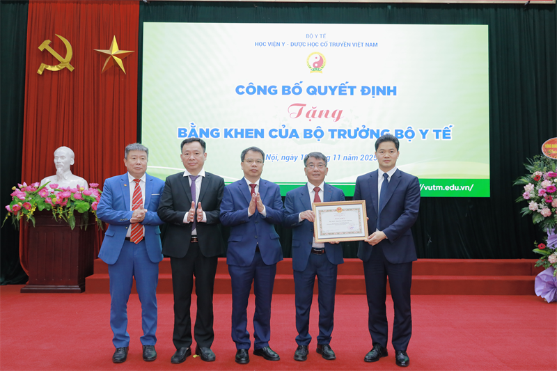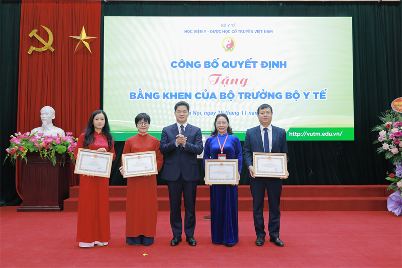 Tại buổi làm việc, Thứ trưởng đã gửi lời chúc mừng nhân Ngày Nhà giáo Việt Nam 20/11 tới tập thể thầy cô và sinh viên Học viện đồng thời trao tặng Bằng khen của Bộ trưởng Bộ Y tế cho các tập thể và cá nhân có thành tích xuất sắc trong các hoạt động thuộc A80. Đây là sự ghi nhận quý báu cho những nỗ lực bền bỉ của đội ngũ cán bộ giảng viên, thầy thuốc và sinh viên trên hành trình giữ gìn và phát triển tinh hoa y học cổ truyền.