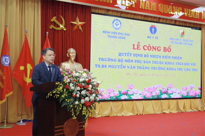 Tại buổi lễ, PGS.TS Nguyễn Quốc Huy, Giám đốc Học viện Y - Dược học cổ truyền Việt Nam trực tiếp trao Quyết định và giao nhiệm vụ cho TS.BS Nguyễn Văn Thắng. Giám đốc Học viện cũng bày tỏ sự tin tưởng sâu sắc rằng, với kinh nghiệm dày dặn, năng lực chuyên môn vững vàng tại bệnh viện Phụ sản Trung ương, cùng với tâm huyết lớn dành cho công tác đào tạo, TS.BS Nguyễn Văn Thắng sẽ là nhân tố then chốt, góp phần nâng cao chất lượng đào tạo, thúc đẩy nghiên cứu khoa học và đưa Bộ môn Phụ sản của Học viện lên một tầm cao mới.