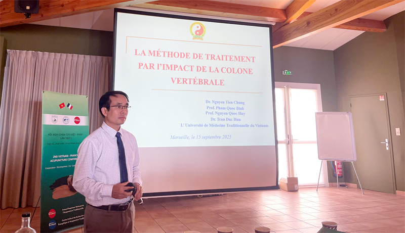 TS. Nguyễn Tiến Chung - Phó Giám đốc Bệnh viện Tuệ Tĩnh trình bày báo cáo tham luận "Phương pháp tác động cột sống". Đây là một phương pháp độc đáo của Việt Nam, tập trung vào việc điều chỉnh các sai lệch trên cột sống để cải thiện các vấn đề liên quan đến cơ xương khớp, thần kinh, và các bệnh lý nội tạng. Báo cáo đã nhận được sự quan tâm lớn từ các chuyên gia y tế Pháp, những người đánh giá cao tính hiệu quả và an toàn của phương pháp này.
