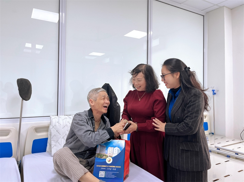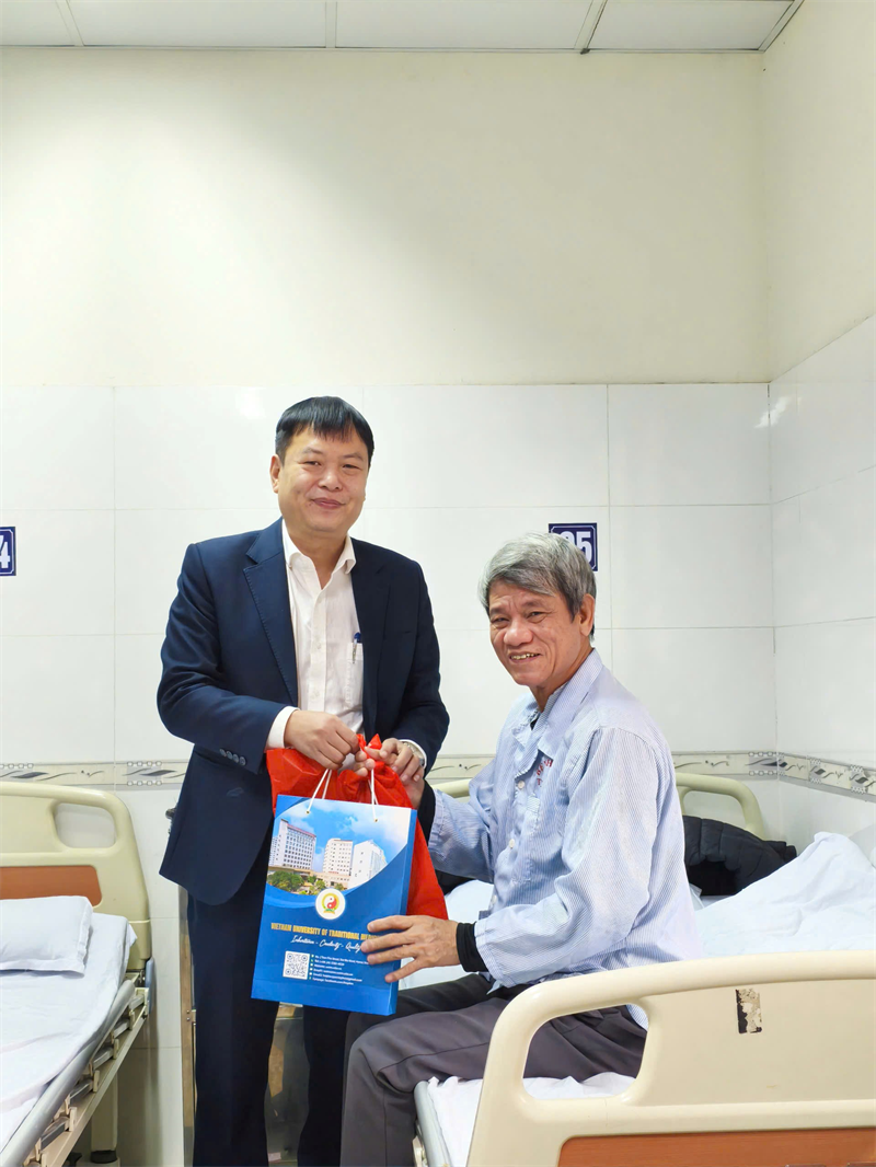 ThS. BSCKII Nguyễn Vinh Huy Chính - Chủ tịch Công đoàn Học viện tặng quà và tâm sự động viên bệnh nhân đang điều trị nội trú tại Bệnh viện Tuệ Tĩnh